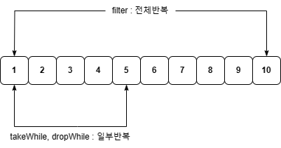 - takeWhile - Predicate의 반환 값이 false가 나오면 반복 작업 중단 후 현재까지 요소들을 반환