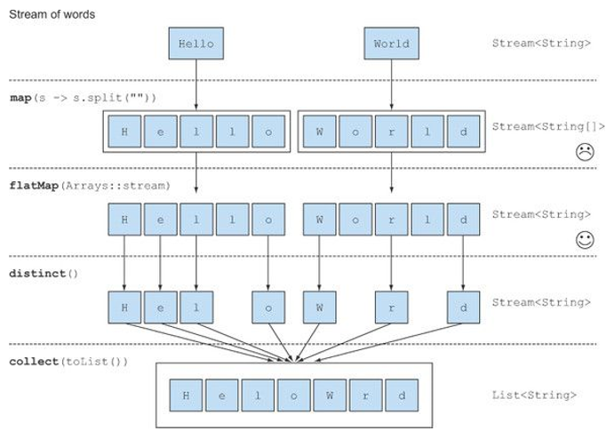 flatMap | Stream<R> | Function<T, Stream<R>> | T → Stream<R> | |