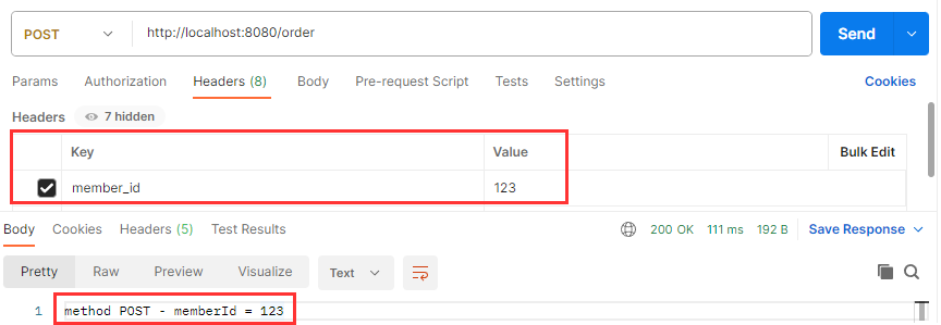 헤더에 key=member_id, value=123을 넣어 요청한 결과를 보면 value 값인 123을 정상적으로 가져온 것을 확인할 수 있습니다.