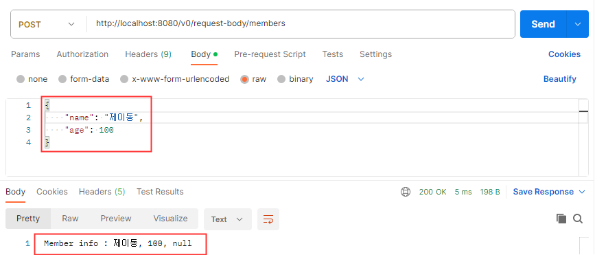 return ResponseEntity.ok("Member info : " + memberDto.getName() + ", " + memberDto.getAge() + ", " + memberDto.getCellphone());