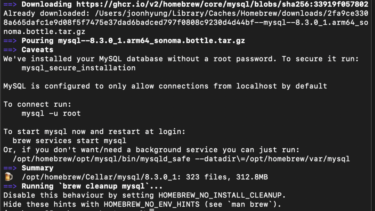 을 통해 설정을 마무리하라고 나온다. 또한 시작 프로세스에 등록하여 부팅 시 MySQL을 자동으로 실행해 주는 명령어(brew services start mysql